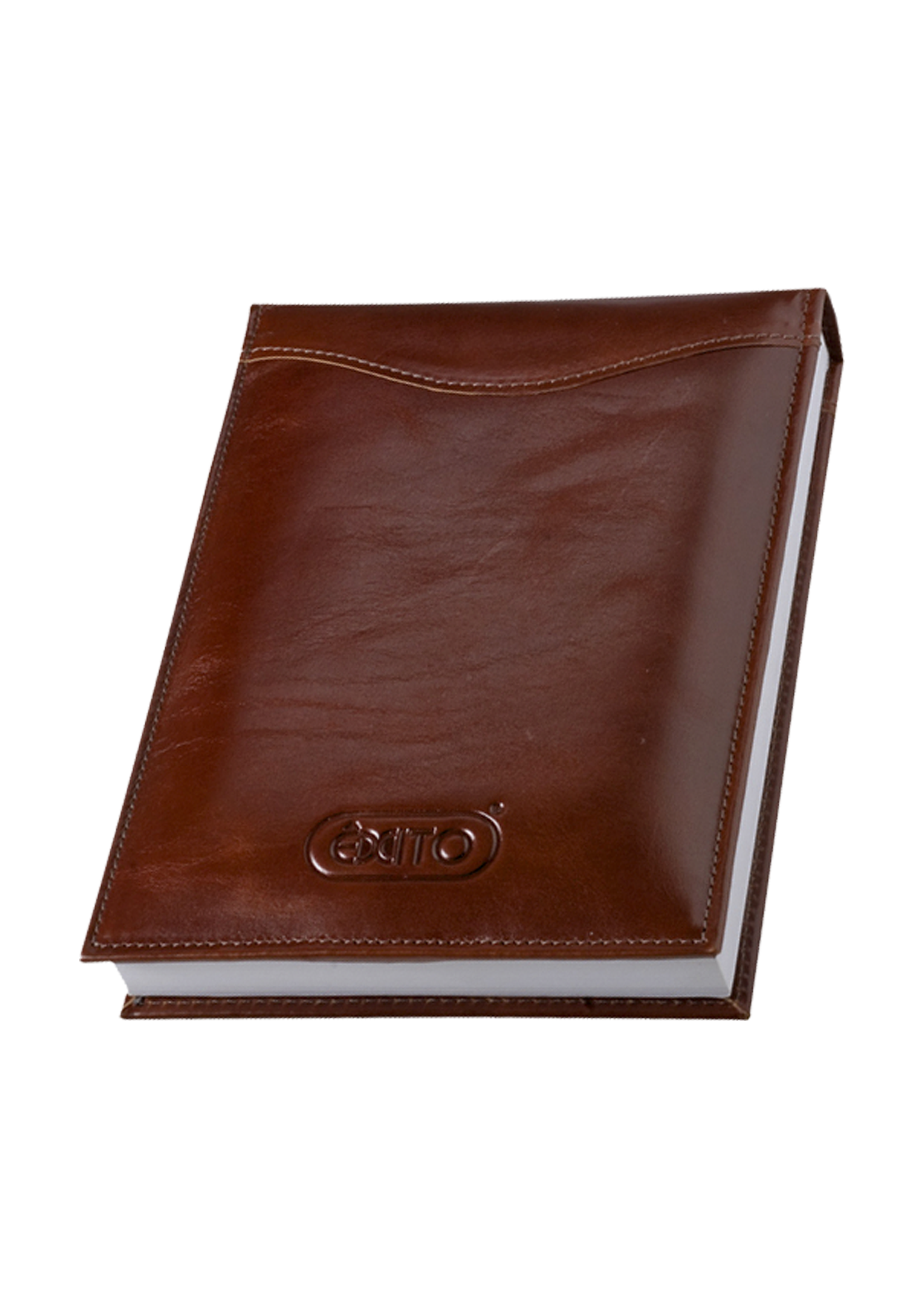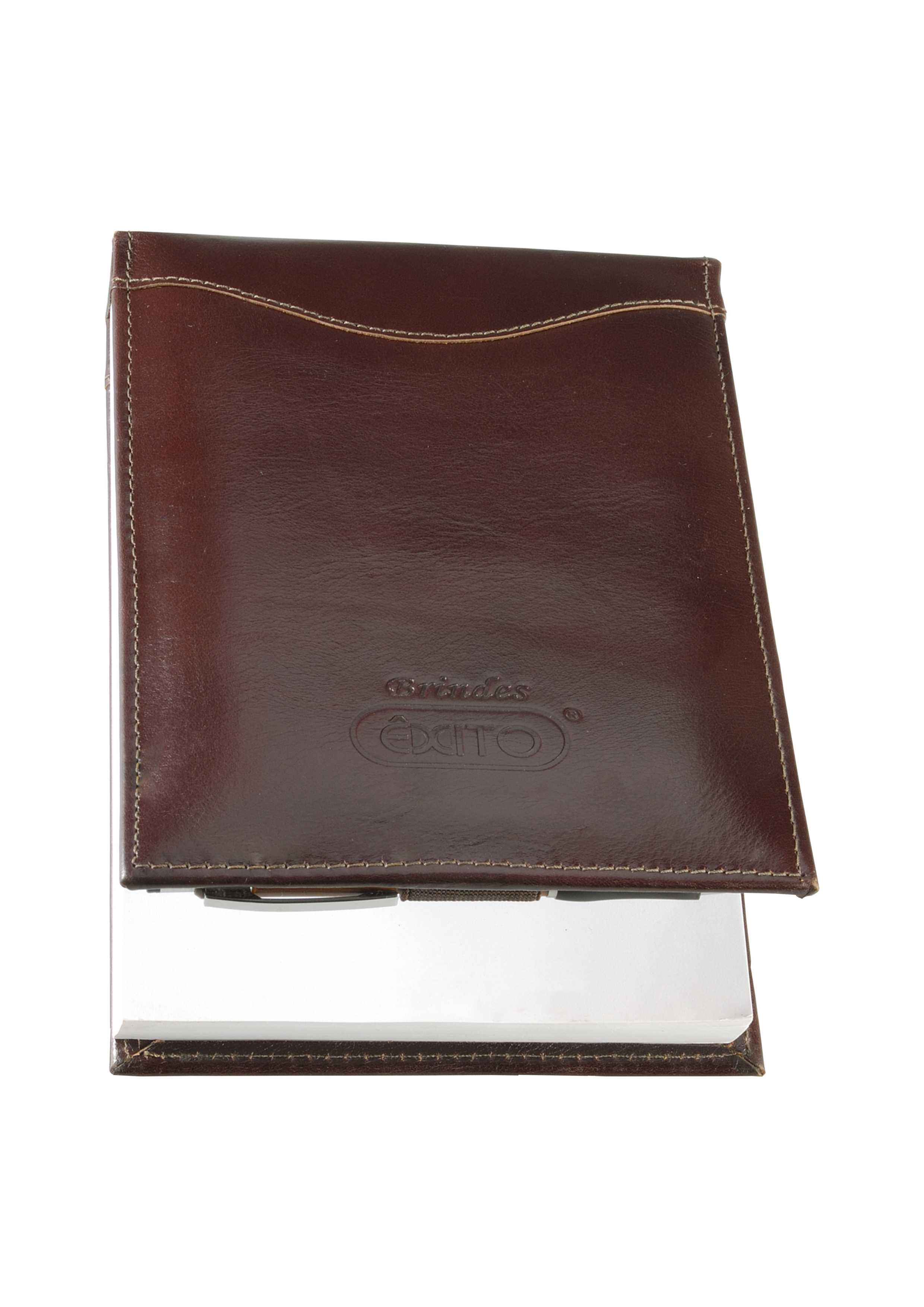 Porta Bloco de Anotações, podendo ser confeccionado em Couro Natural ou material sintético, totalmente pespontado, forrado internamente em material especial, contendo bolso interno, bloco de papel com 200 folhas brancas e porta caneta.
