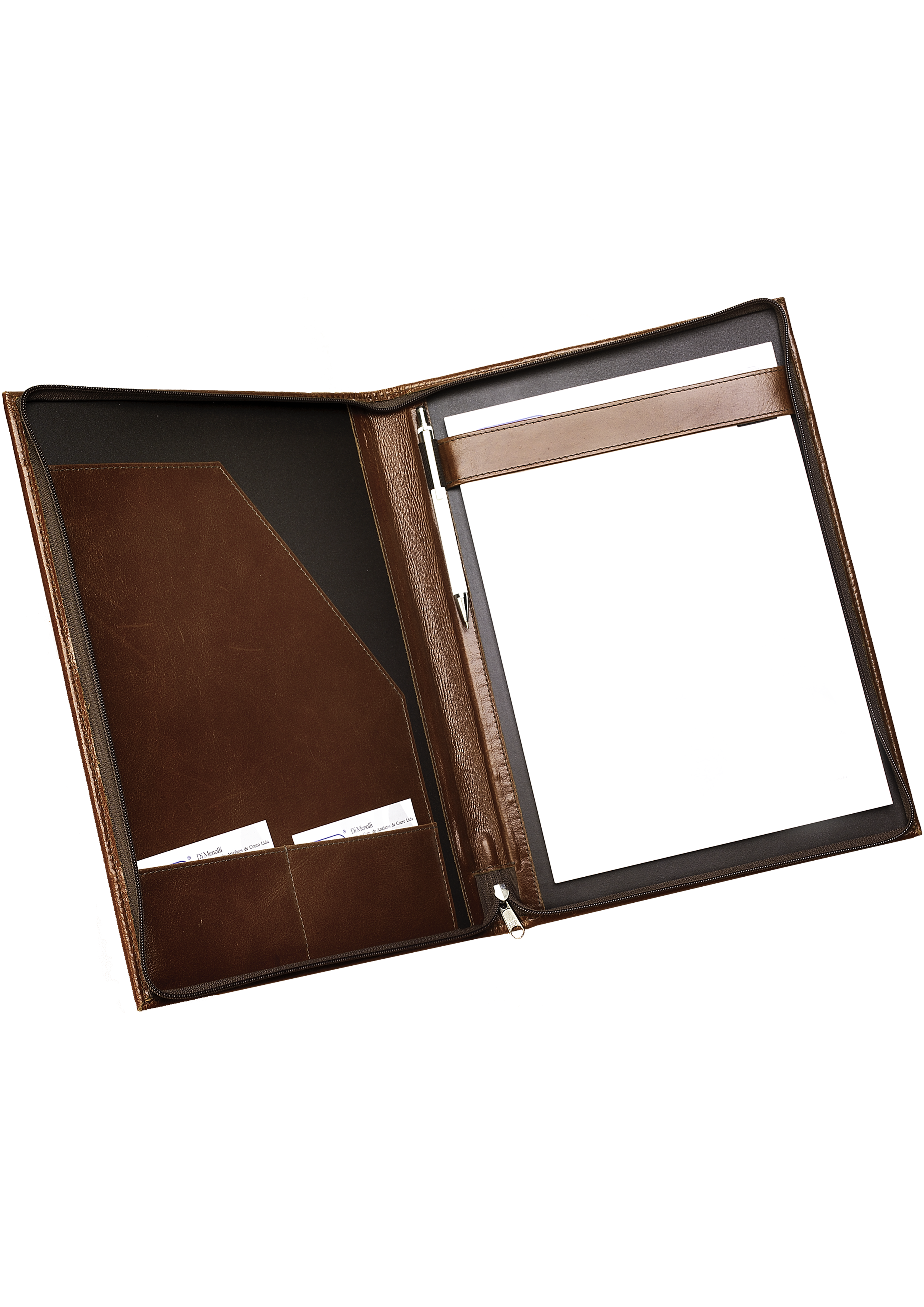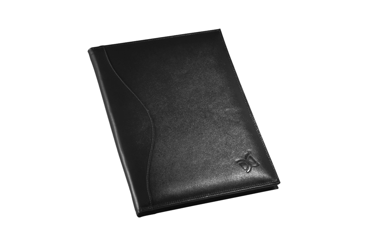 Pasta Convenção Modelo Padrão, podendo ser confeccionada em Couro Natural ou material sintético, totalmente pespontada, forrada internamente em material especial, contendo aba lateral, dois porta cartões, porta caneta e porta bloco.